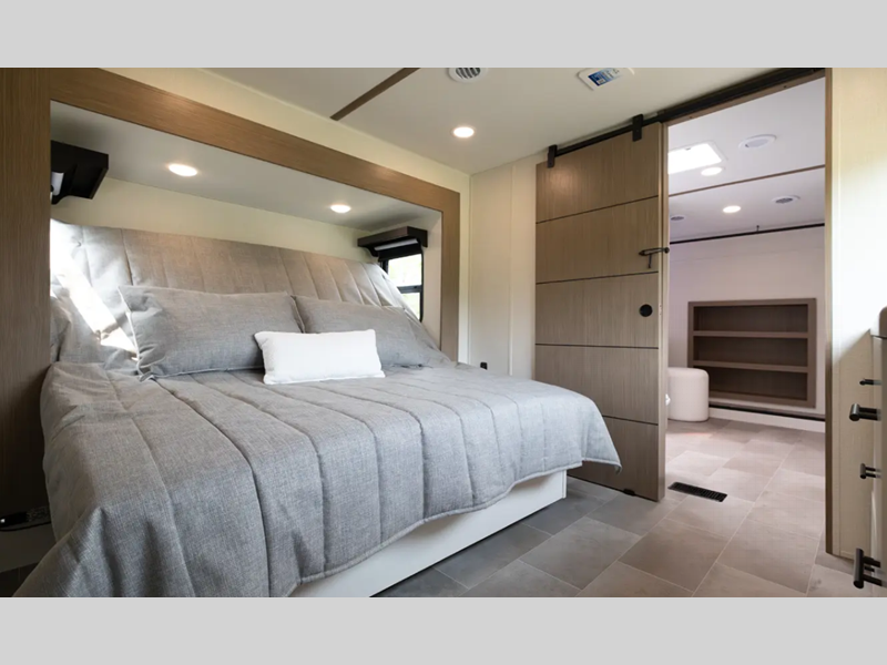 Each fifth wheel is constructed with an vacuum bonded aluminum structure with laminated aluminum sidewalls, slide boxes, a front wall and floor, plus one-piece Tufflex PVC roofing for more strength. The exterior offers a black tank flush, winterization and sanitation an enclosed docking station, and off-grid camping including a solar on the side prep. The interior includes residential linoleum, blackout curtains and roller shades, residential backsplash, and oversized opening windows for great views and circulation of natural air.
