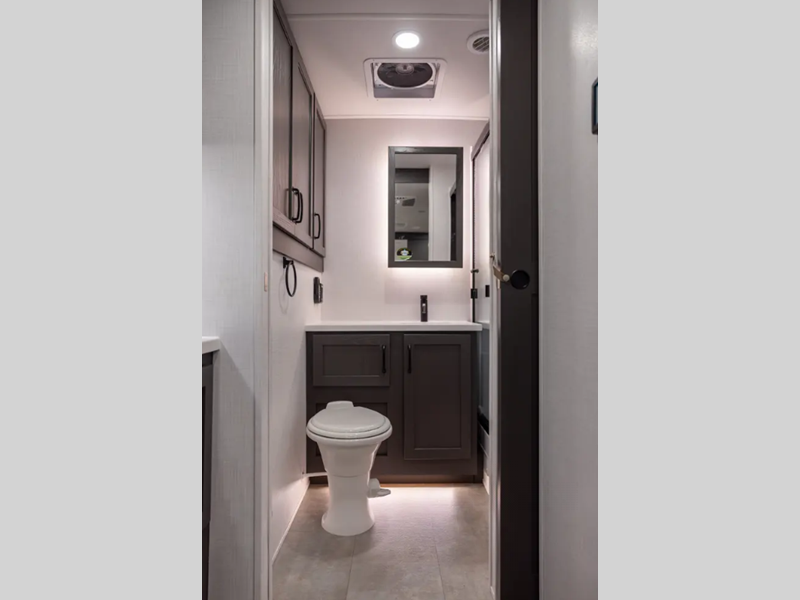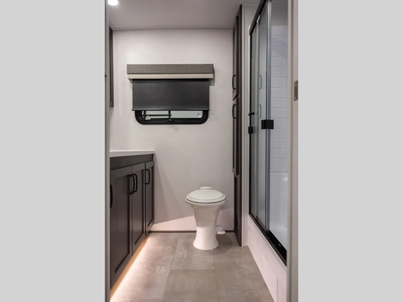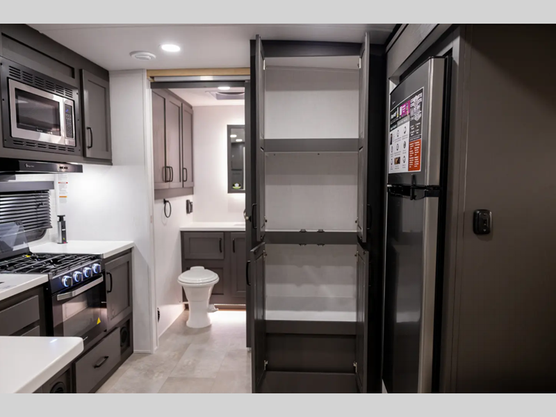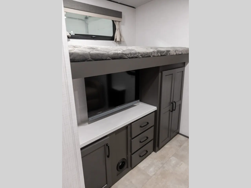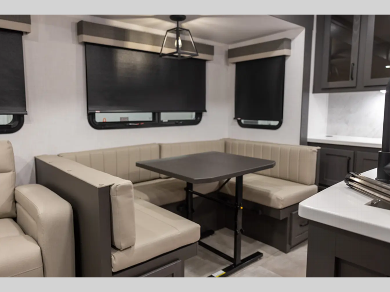 Outside, you'll find a power awning with an adjustable rain dump and LED lighting, backup camera pre, Keyed Alike locks, plus many more conveniences. The enclosed underbelly will help extend your camping season, and you can enjoy your RV for years thanks to the durable construction materials, like the radiant foil insulation and 5/8" plywood tongue and groove subfloor. Each fifth wheel and travel trailer also includes lino flooring in all slides, aluminum dinette, bed and bunk, plus solid surface kitchen countertops.