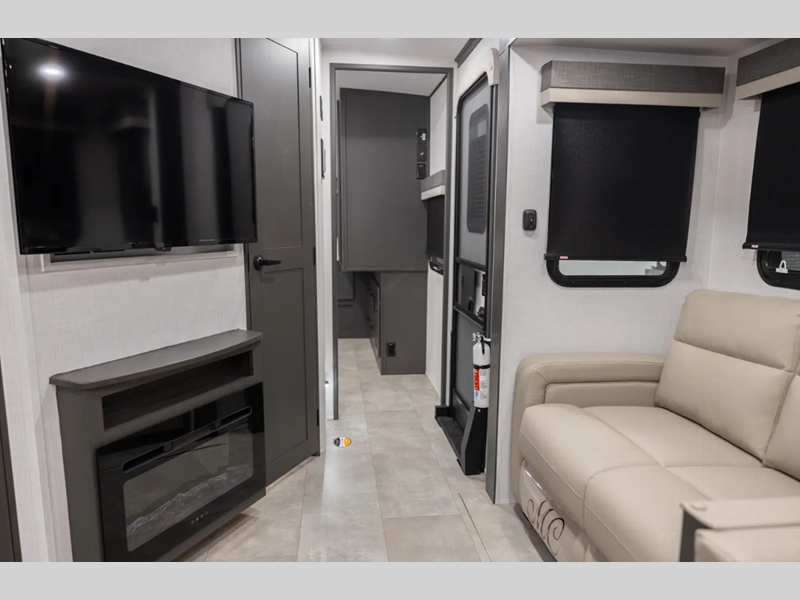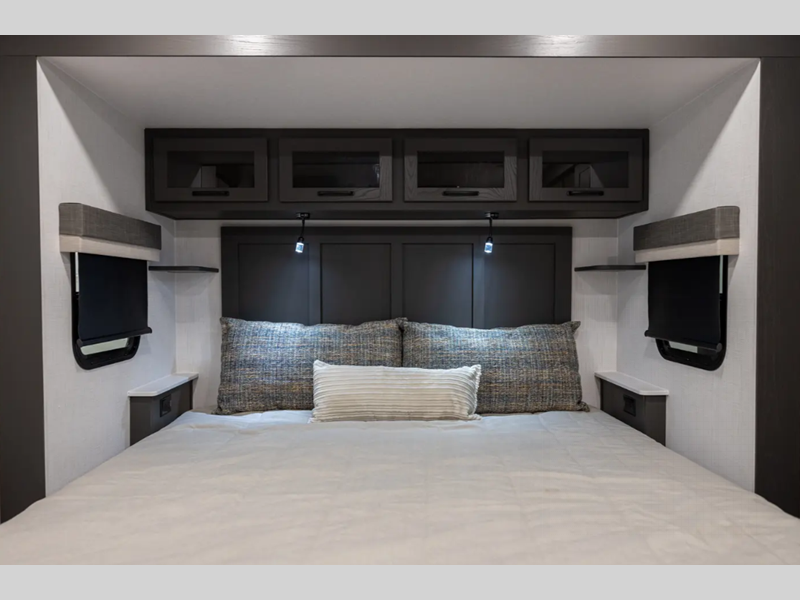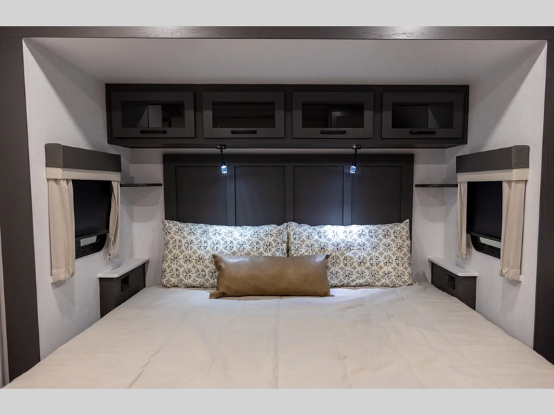 Sleeps 2 Slides 2 Length 29 ft 11 in Ext Width 8 ft Ext Height 11 ft 7 in Hitch Weight 1010 lbs Dry Weight 7649 lbs Cargo Capacity 2161 lbs Fresh Water Capacity 54 gals Grey Water Capacity 78 gals Black Water Capacity 39 gals Furnace BTU 35000 btu Available Beds King Refrigerator Type 12V Cooktop Burners 3 Number of Awnings 1 LP Tank Capacity 30 Lbs. Water Heater Capacity 6 gal Water Heater Type Quick Recovery Gas/Electric TV Info LR Smart TV Awning Info 22' Power w/Rain Dump and LED Lights Axle Count 2 Number of LP Tanks 2 Shower Type Shower w/Seat Electrical Service 50 amp Solar Wattage 200 watts Similar Floorplans