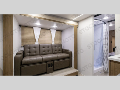You're going to love every minute spent in this couple's trailer. The queen bed in the front private bedroom will provide a great night's rest, and there are dual wardrobes to easily get dressed in the morning. Head to the kitchen through the bath, then prepare eggs and bacon on the two-burner cooktop. There is a sofa slide out here to enjoy your coffee at each morning, or you may want to get some work done at the mobile workstation!