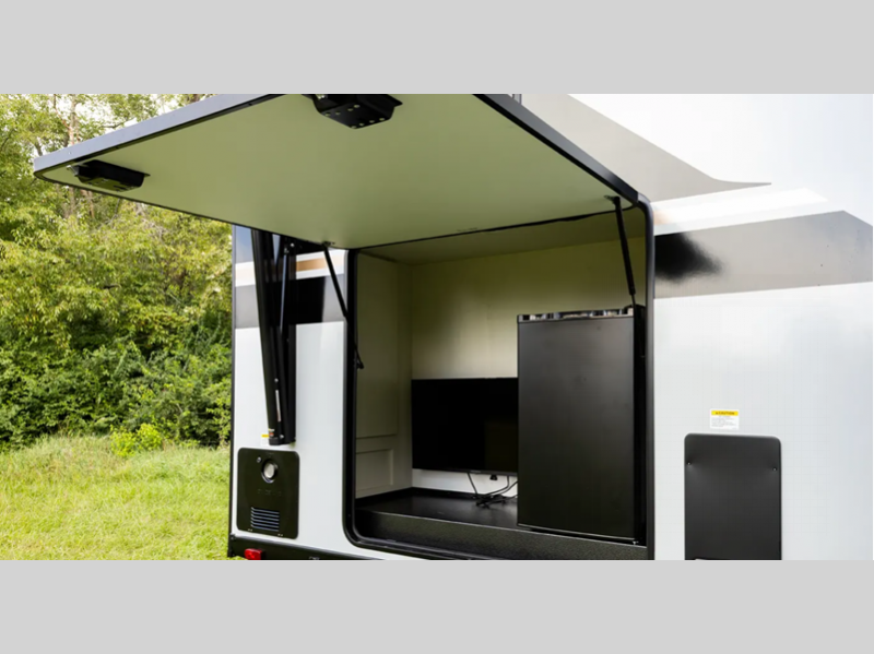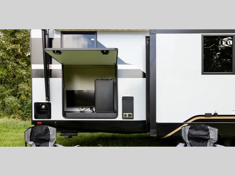 - Universal Docking Station Enclosed in Cargo Storage - Hookups Included: Cable & Satellite Switch, Fresh-Tank Gravity Fill, City Water, Black Tank Flush, Winterization Pump, Outdoor Shower, GFI Outlet, And Space Prepped for Solar Panel Controller