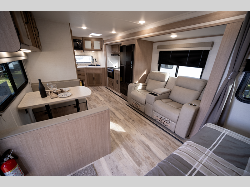 You'll instantly feel at home when you step inside to find craft-made cabinetry, high-performance vinyl flooring throughout, and a cozy queen bed. The 16,000 BTU gas furnace and fiberglass insulation will allow you to camp year around, and the 13,500 BTU A/C will be perfect for summer. . There is a pass-through storage on most models, plus a tankless water heater and many more conveniences.