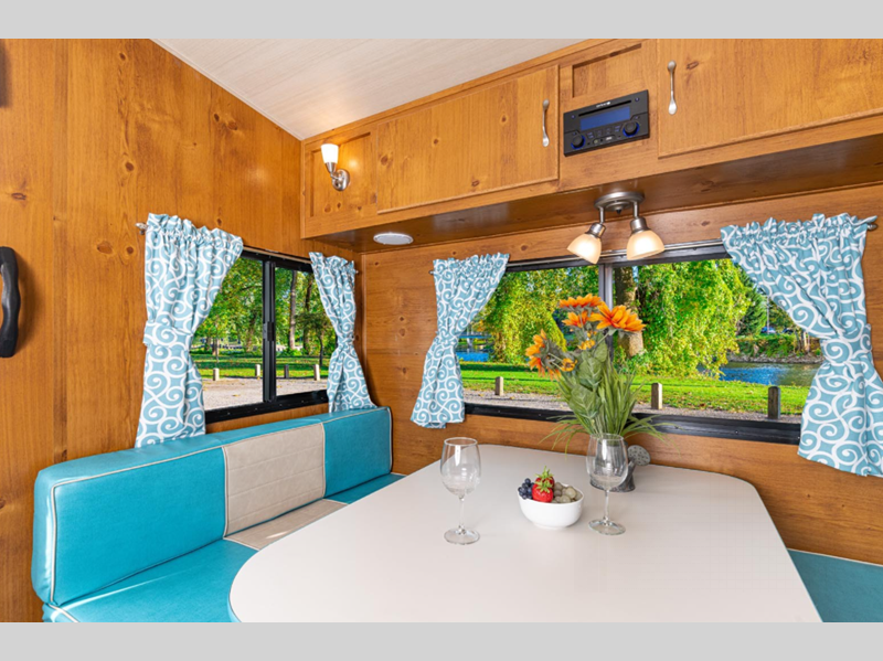 Since these models are constructed with laminated fiberglass sidewalls with an exterior layer of Azdel, they are both lightweight and durable. The easy-lube axles will provide smooth towing, and the hitch light will allow you to get on the road in no-time. Inside, you'll love the vintage dinette and vintage cabinet doors, plus high-performance vinyl flooring and cream countertops with self-edging. There are multiple USB ports to keep your electronics charged and ready to go, plus a convenience switch panel with a tank monitor to access your trailers functions in one easy location.